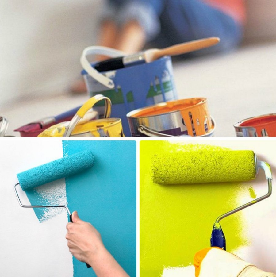 Малярные валики и кисти, пластмассовые ванночки с сетками для прокатки валиков. Работая с качественными инструментами можно избежать подтёков на стенах и выделения вертикальных окрасочных полос.