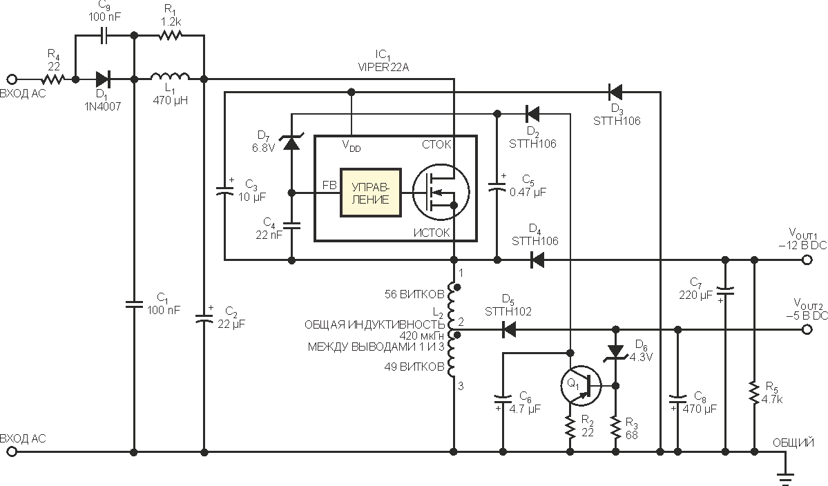 В качестве альтернативы вы можете использовать однокристальный контроллер импульсного преобразователя, такой, например, как Viper22A, выпускаемый STMicroelectronics (IC1 на Рисунке 1), с помощью которого из напряжения сети переменного тока от 88 В до 265 В можно получить два стабилизированных напряжения суммарной мощностью до 3.3 Вт. При указанных на рисунке номиналах компонентов схема обеспечивает нагрузку напряжениями –5 В ±5% при токе до 300 мА и –12 В ±10% при токе до 150 мА.