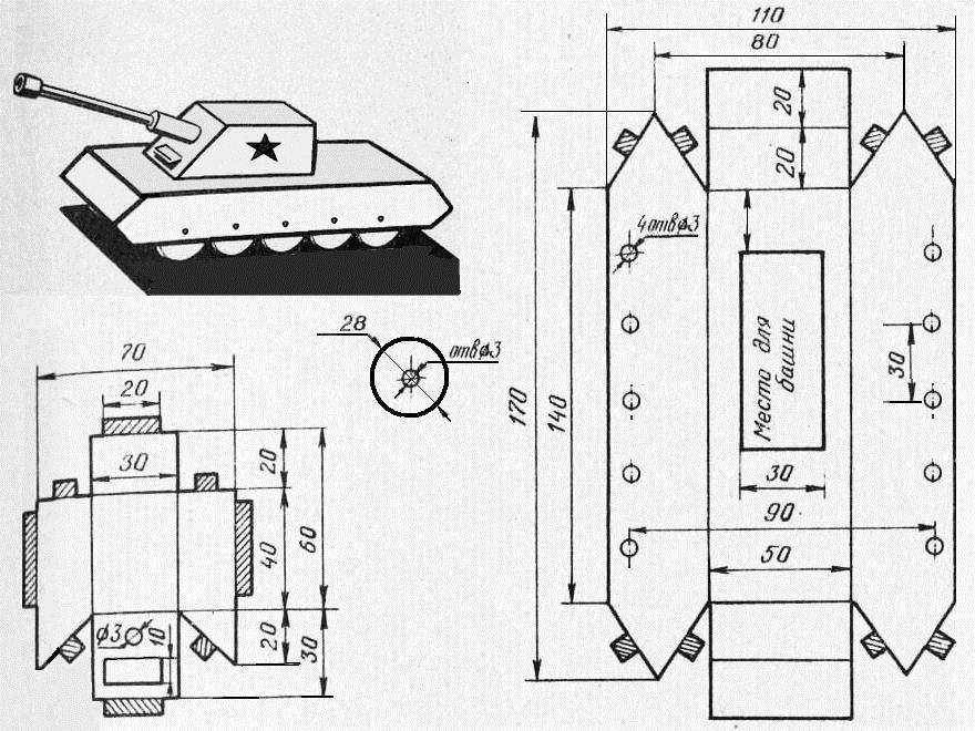 1. Самая кропотливая часть работы-чертеж будущего танка по отдельным частям с точно выверенными размерами. На картоне отметить границы детелей можно с помощью небольших проколов иглой. Точки аккуратно соединяются карандашом.