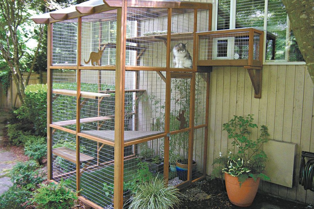 Кошачий вольер можно поставить впритык к стене — если в такой конструкции сделать проход через окно, животные смогут заходить в дом