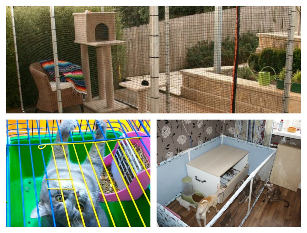 Стоит различать клетки, манежи и вольеры. Они похожи, так как представляют собой огороженную конструкцию, но есть существенные различия. Клетка предполагает временное размещение животного, имеет небольшие размеры. В ней отсутствуют условия для времяпрепровождения зверя (в лучшем случае в клетку ставят миски с водой и едой и подстилку). В просторном и обустроенном вольере кот может не только поесть и поспать, но и поиграть. Отличие от манежа состоит в наличии крышки — у манежной конструкции она отсутствует, есть только боковые стенки, поэтому она может удержать только маленьких котят.