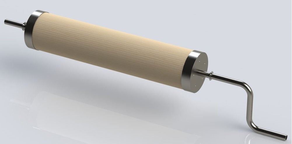 Сборку начинаем с прикручивания планок к рёбрам оцинкованными шурупами 4×50 мм с клеем ПВА. Три последние планки пока не устанавливаем, чтобы обеспечить доступ внутрь цилиндра. Затем фиксируем ось -шпильку длиной 445 мм с одной стороны цилиндра в отверстиях рёбер. Её вкручиваем, используя для захвата две гайки М16 на конце шпильки, навинченных до контровки.