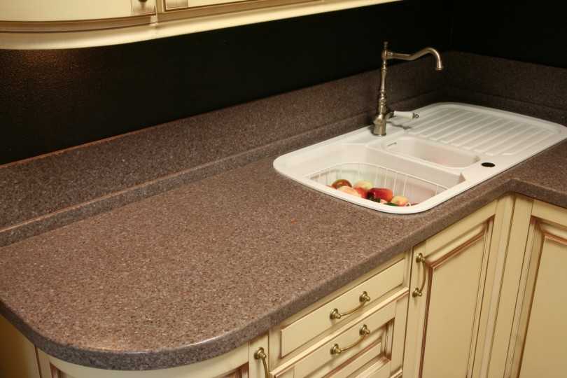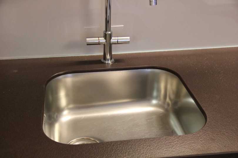 Врезную мойку можно крепить вровень со столешницей – однако это трудоемкий процесс, требующий опыта, поскольку подразумевает снятие слоя столешницы под бортиком. Глубина снятия равняется высоте бортика со слоем герметика.