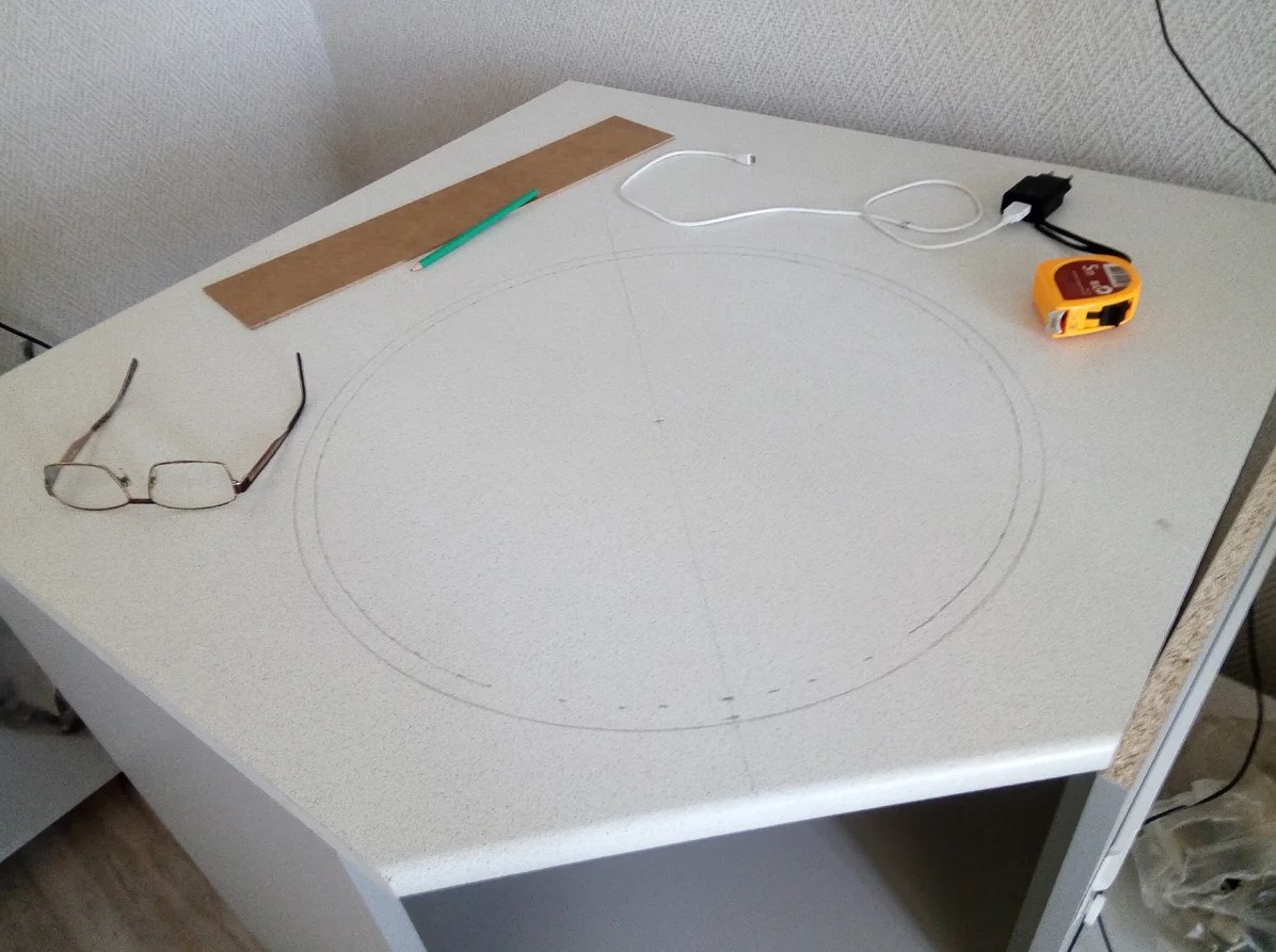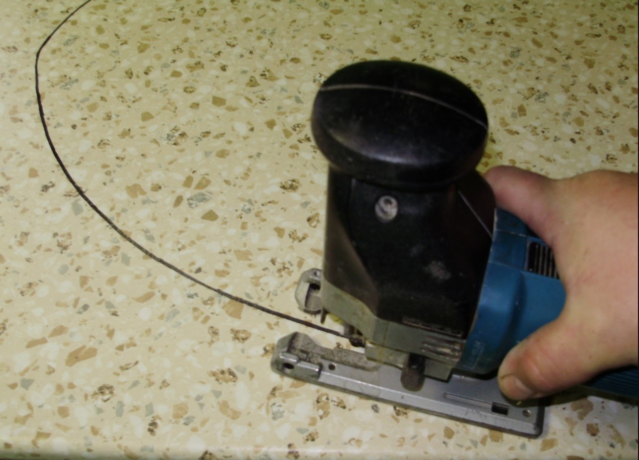 Возьмите электродрель со сверлом O 10 мм и просверлите на внутренней отметке отверстие в столешнице для вставки в него пилки от электролобзика. После этого не торопясь и бережно вырежьте по линии.