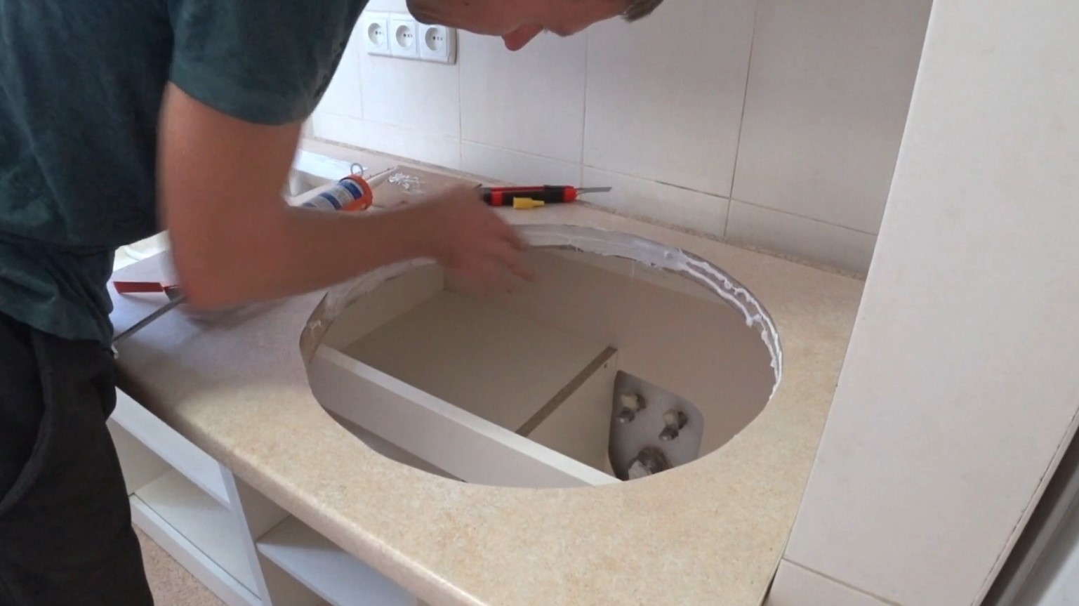 - Силиконовым герметиком промажьте внутреннюю часть мойки и установите ее на столешницу.