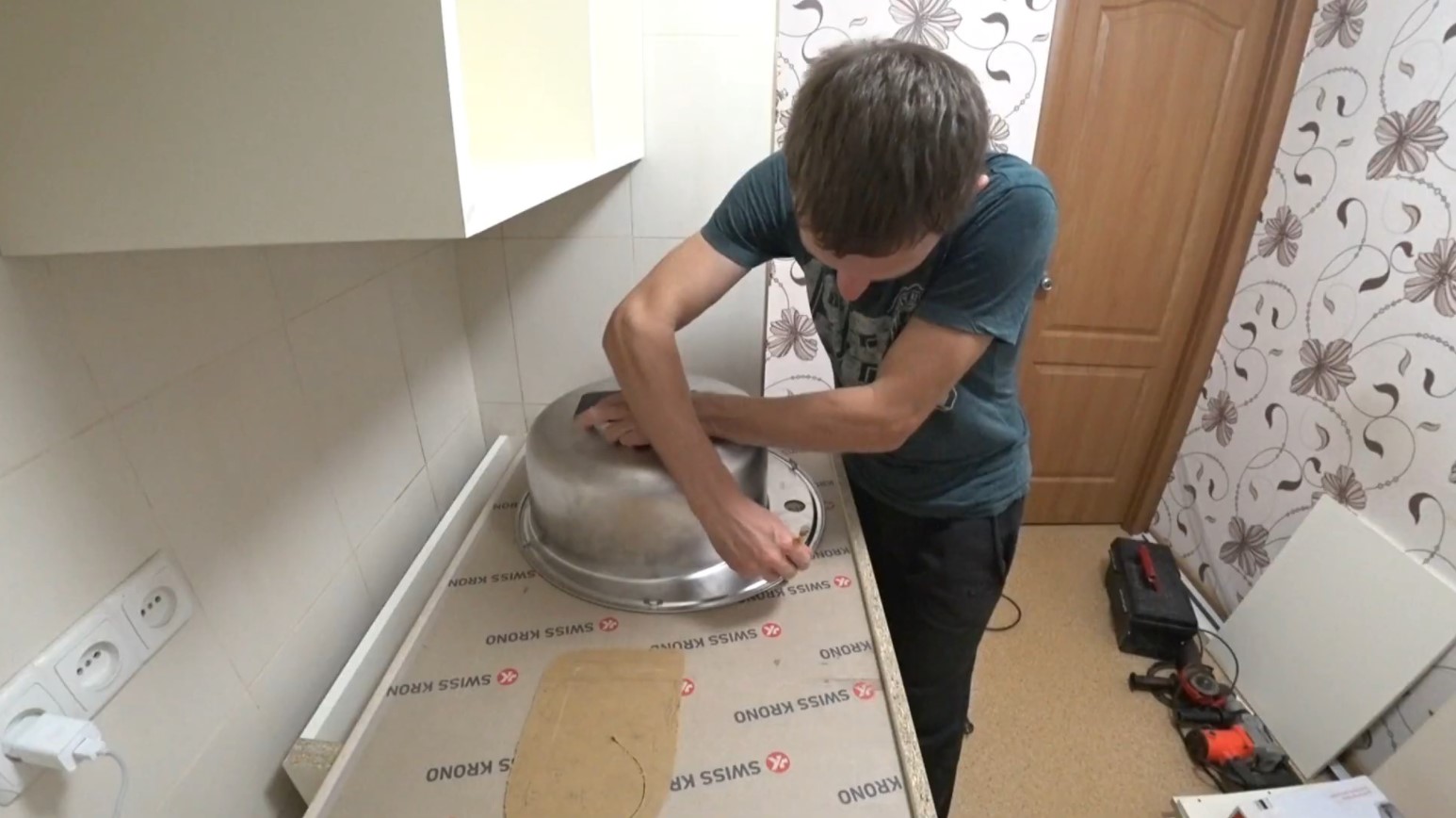 Для этого нужно на лицевой стороне столешницы обвести контур мойки. Хорошо, если вместе с ней идет шаблон: приложили, обвели — идем дальше.