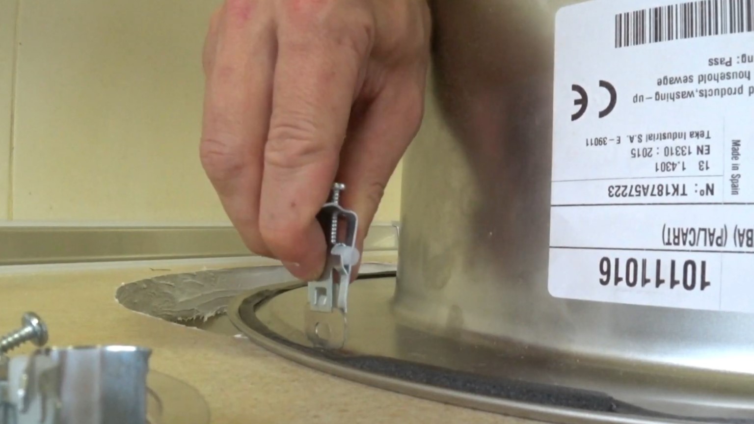 Загнув крепления внутрь, вставляем мойку в отверстие. Переверните столешницу и затяните крепежи.