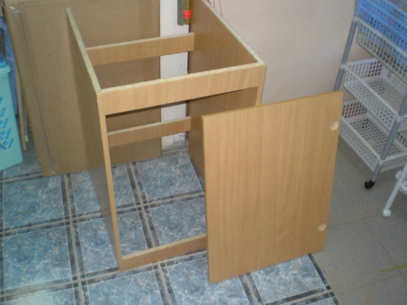 Высота брусков подбирается с тем учетом, чтобы мойка находилась на том же уровне, что и остальная кухонная мебель. Под размер тумбы обрезаются бруски и скрепляются с внешней стороны с помощью мебельных уголков. Самодельная конструкция устанавливается на тумбу и уголками с саморезами с внутренней стороны прикручивается к стенкам подстолья.