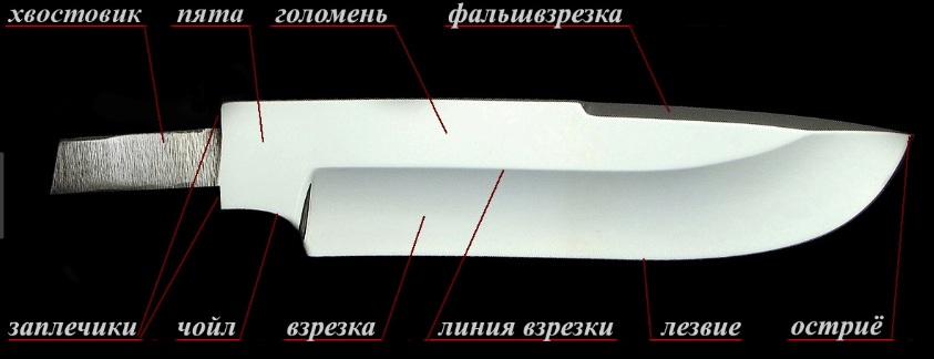 Также в зависимости от ширины хвостовика рукоять будет либо всадной, либо накладной. Это мы подробнее рассмотрим дальше, а пока посмотрите на фото, где подписаны название основных частей ножевого клинка.