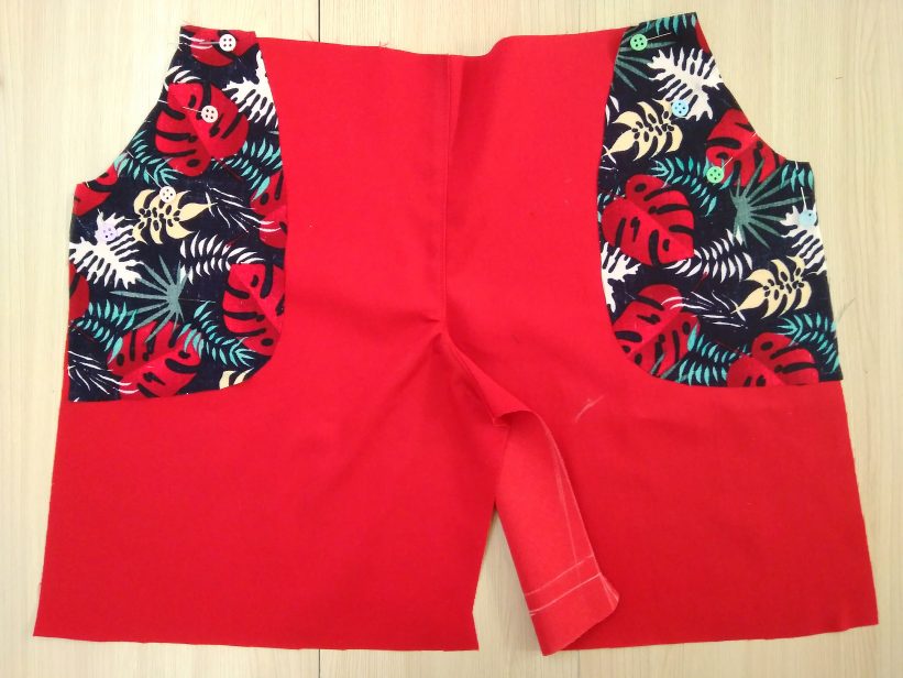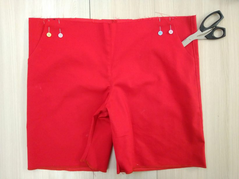 01. Вырезаю детали шортиков вместе с припусками, которые уже включены в выкройку. Мешковины карманов я делала из другой ткани, поэтому здесь их нет.