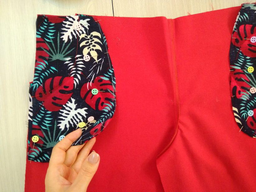 Накладываю мешковины карманов на передние детали шорт лицевыми сторонами внутрь. Скрепляю выкройки между собой булавками.