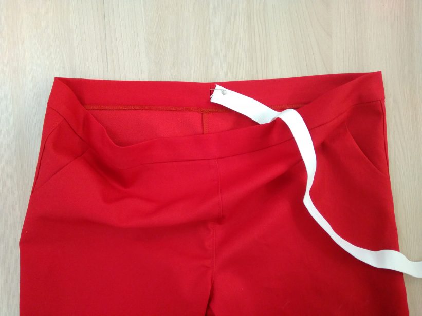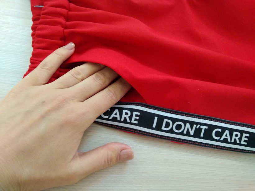 После чего перегибаем подгибку с резинкой на изнаночную сторону, с лицевой стороны прокладываем строчку на ширину резинки, при этом растягивая резинку с тканью.