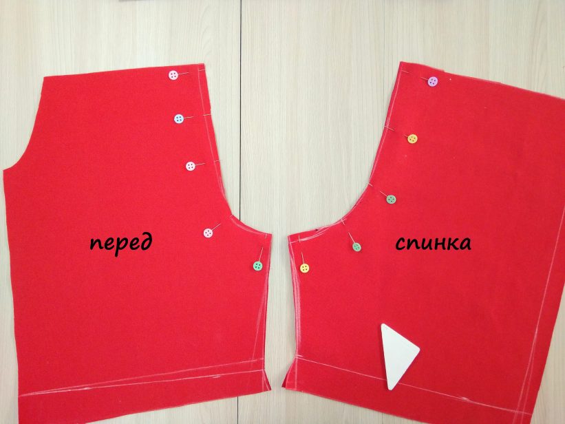 02. Соединяю детали по средним срезам. Для этого попеременно накладываю детали полочки и спинки друг на друга лицевыми сторонами внутрь, скалываю булавками, стачиваю на швейной машинке.