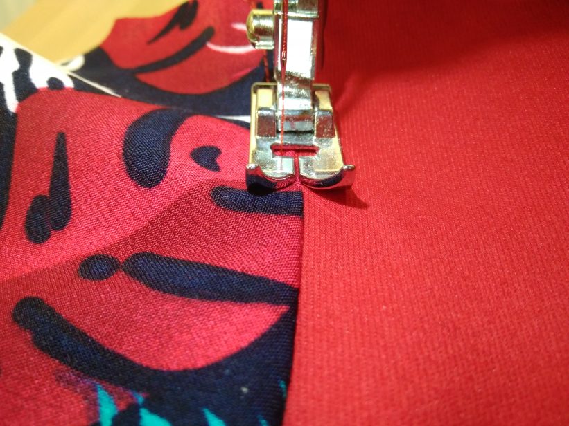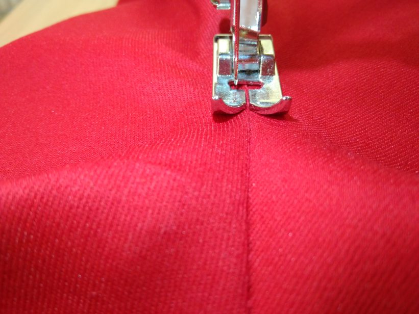 Прокладываю строчку по лицевой стороне, попадая иглой в шов притачивания. Этим я как бы прячу строчку внутрь, и она становится невидимой с лицевой стороны.