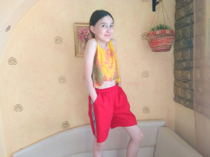 Что могу сказать по итогу. Шортики дочери понравились, несмотря на спорный цвет. Они хорошо комбинируются как с футболками, так и со строгим верхом. Думаю даже с колготками и кофтой они будут неплохо смотреться. По времени пошив шорт у меня уместился в перерыв, пока я ждала ученицу на курсы.