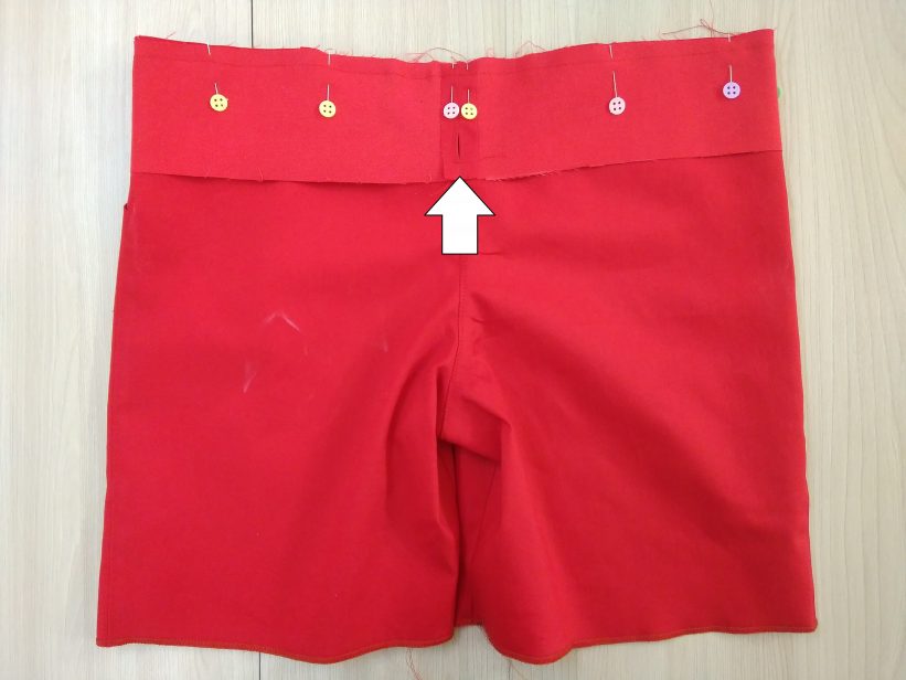 - Накладываю пояс на шорты по линии талии, скрепляю булавками.