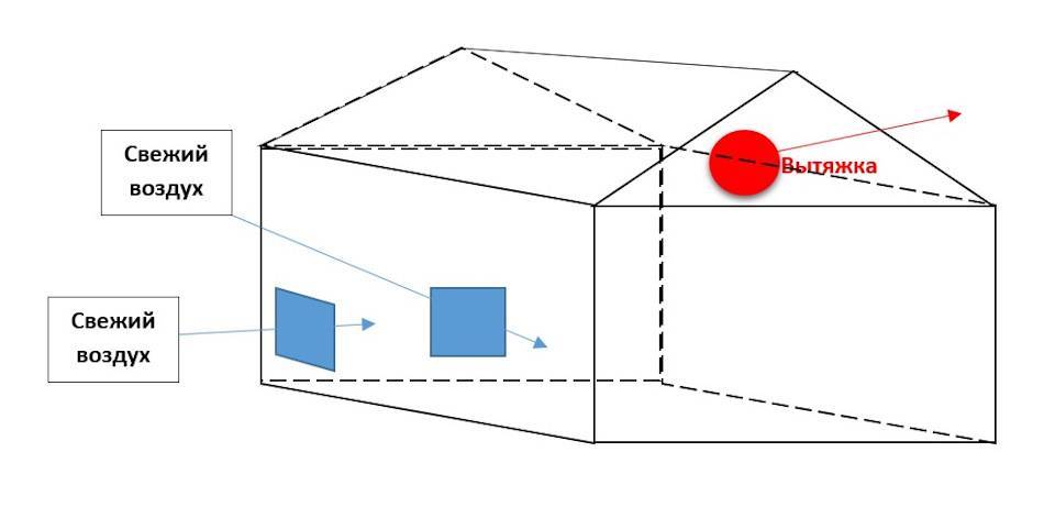 - вытяжка располагается по диагонали как можно дальше от приточного отверстия;