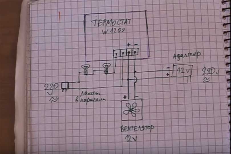 Схема подключения терморегулятора здесь почти такая же, как и было описано выше, только к элементам нагревания добавляются еще: охлаждающий вентилятор, адаптер на 12 вольт, вентилятор, нагревательный элемент — лампочки накаливания.
