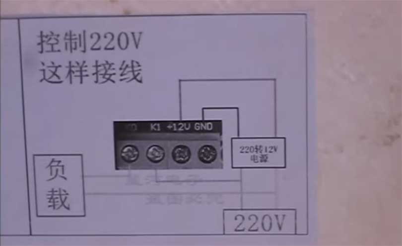 W1209 работает от постоянного тока — 12 вольт. Снизу представлена схема для подключения W1209. На центральном блоке расположены четыре слота. Левые два слота предназначены для подключения нагревательных элементов, правые два — для подключения энергии.