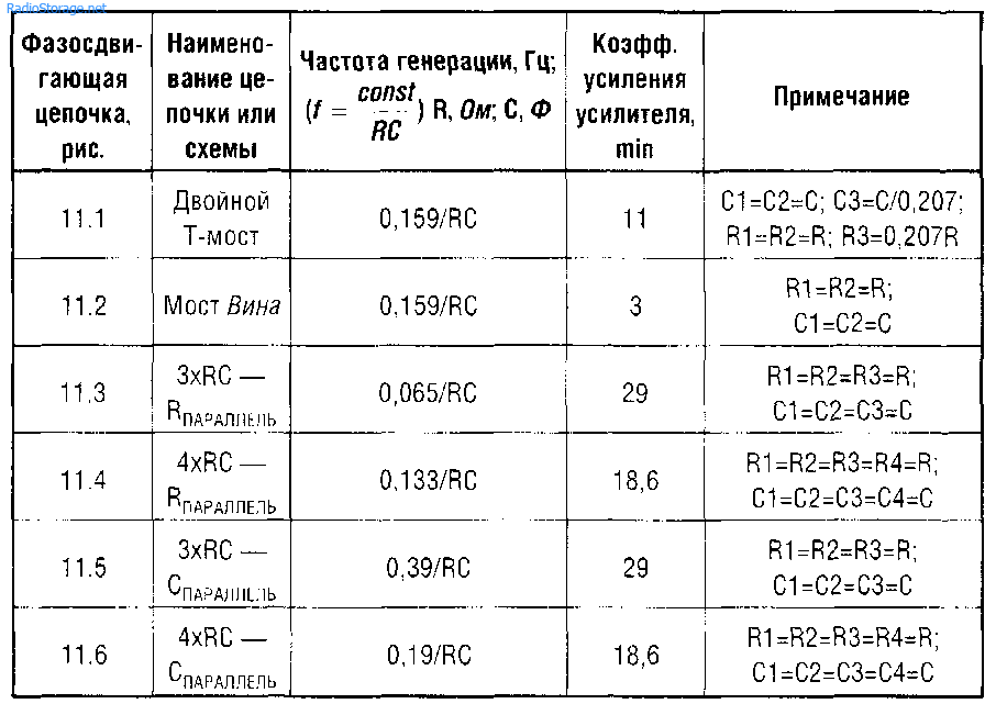 Для сдвига сигнала по фазе используют RC- и LC-цепи, кроме того, сам усилитель вносит в сигнал фазовый сдвиг. Для получения положительной обратной связи в генераторах (рис. 11.1, 11.7, 11.9) использован двойной Т-образный RC-мост; в генераторах (рис. 11.2, 11.8, 11.10) — мост Вина; в генераторах (рис. 11.3 — 11.6, 11.11 — 11.15) — фазосдвигающие RC-це-почки. В генераторах с RC-цепочками число звеньев может быть достаточно большим. На практике же для упрощения схемы число не превышает двух, трех.