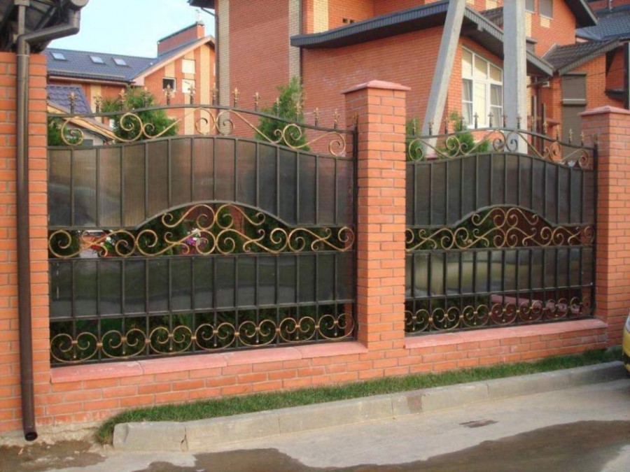 На фото изображена ограда из металла и поликарбоната.