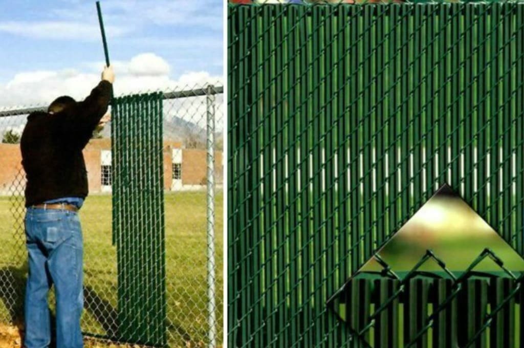 Отличным решением для тех, кто хочет украсить забор и закрыть участок от любопытных глаз может стать использование пластиковых ламелей. Выбирайте материал любого цвета, вставляйте полосы между ячейками и готово. На работу уходит немного времени.