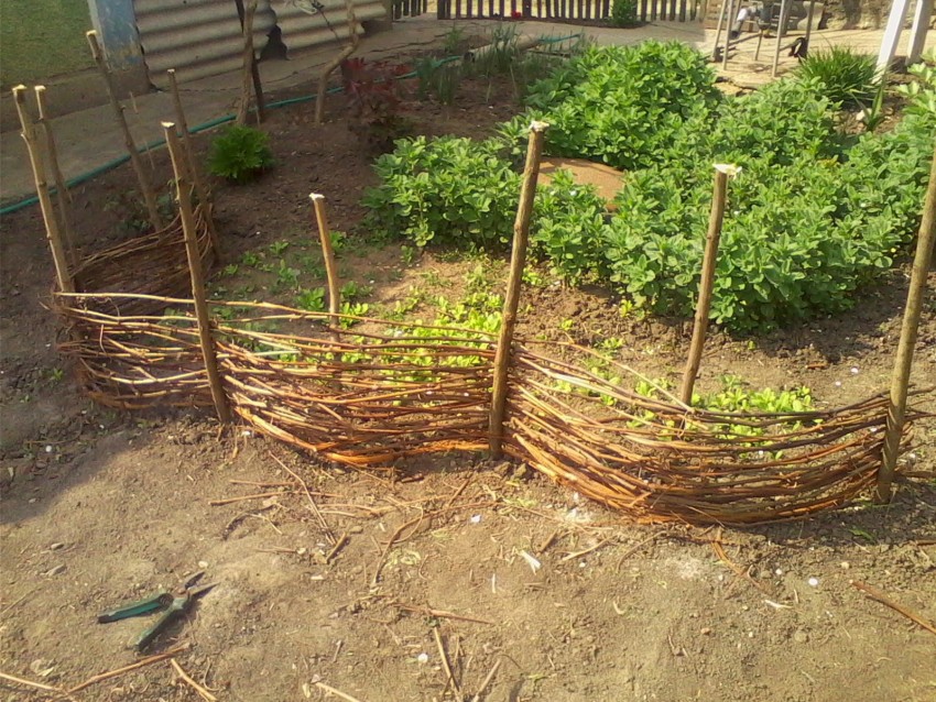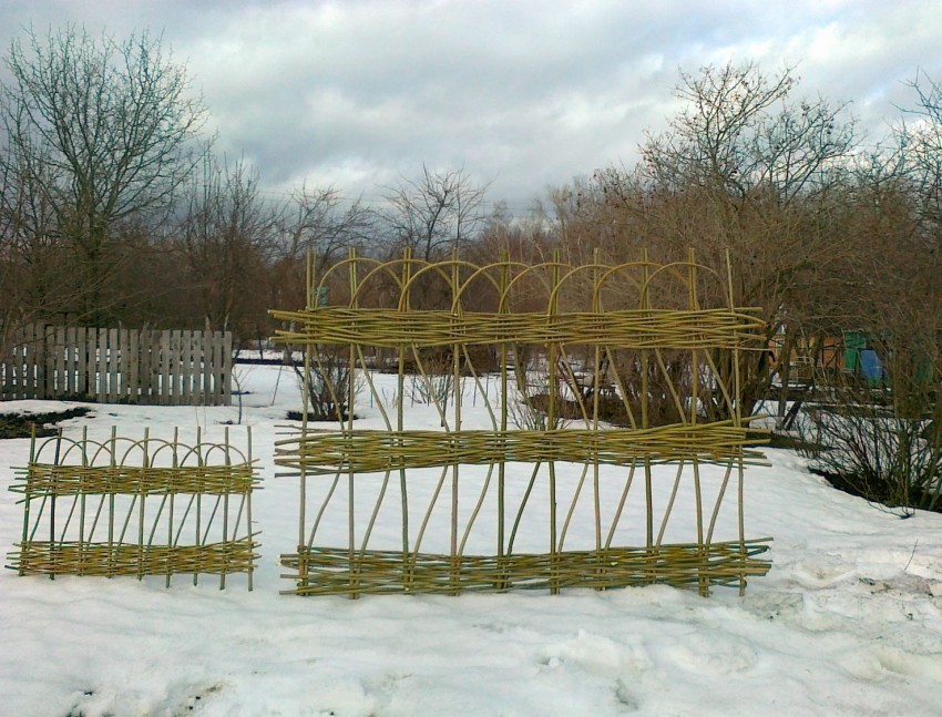 Все очень просто. Прутья лозы перевиваются друг с другом и вкопанными кольями в виде «змейки». Работу нужно начинать снизу. Дерево имеет свойство с течением времени усыхать, поэтому, учитывая это, переплетение нужно делать очень плотным, чтобы не оставалось зазоров.