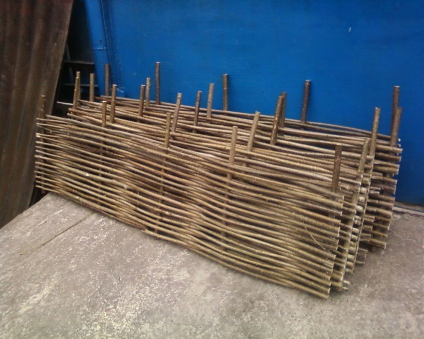 Прутья перед использованием нужно вымочить в воде, для придания им большей гибкости и возможности скрепить их между собой плотно и без явных зазоров. Закрепляют прутья вначале и конце проволокой. Их длина должна быть больше пролета межу столбиками на 10 см.