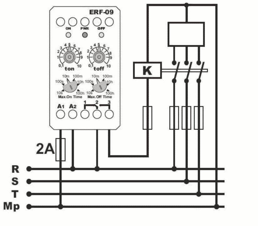 Панель управления реле оборудована кнопкой TEST, с помощью которой проверяется работоспособность устройства путем имитации срабатывания защиты. Кнопка STOP красного цвета позволяет принудительно разомкнуть нормально замкнутый контакт. При этом отключается питание, поступающее на катушку контактора, что в свою очередь приводит к отключению нагрузки. Примерно по такой схеме подключаются и работают все тепловые реле для защиты электродвигателей и их модификации.