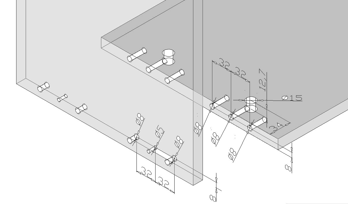 Рис.2. Для установки эксцентриковой стяжки необходимо просверлить несколько отверстий. В одной детали делают несквозное отверстие под эксцентрик диаметром 15 мм и глубиной 12,5 мм (расстояние между центром отверстия и торцом детали равняется длине штока), а также отверстие под шток диаметром 8 мм (расстояние между центром отверстия и поверхностью детали 8 мм). В другой детали делают несквозное отверстие диаметром 5 мм и глубиной 12 мм под установку штока.