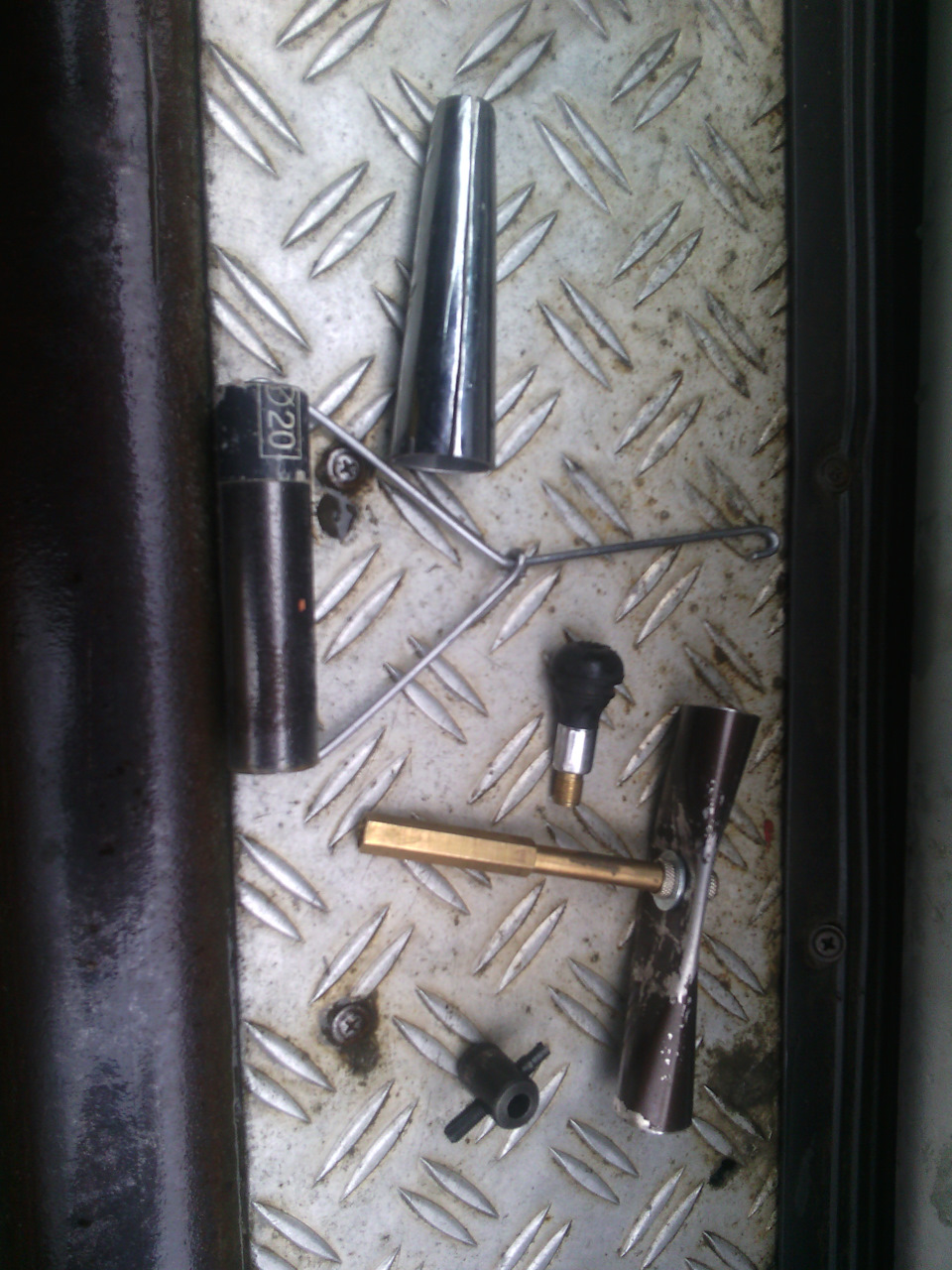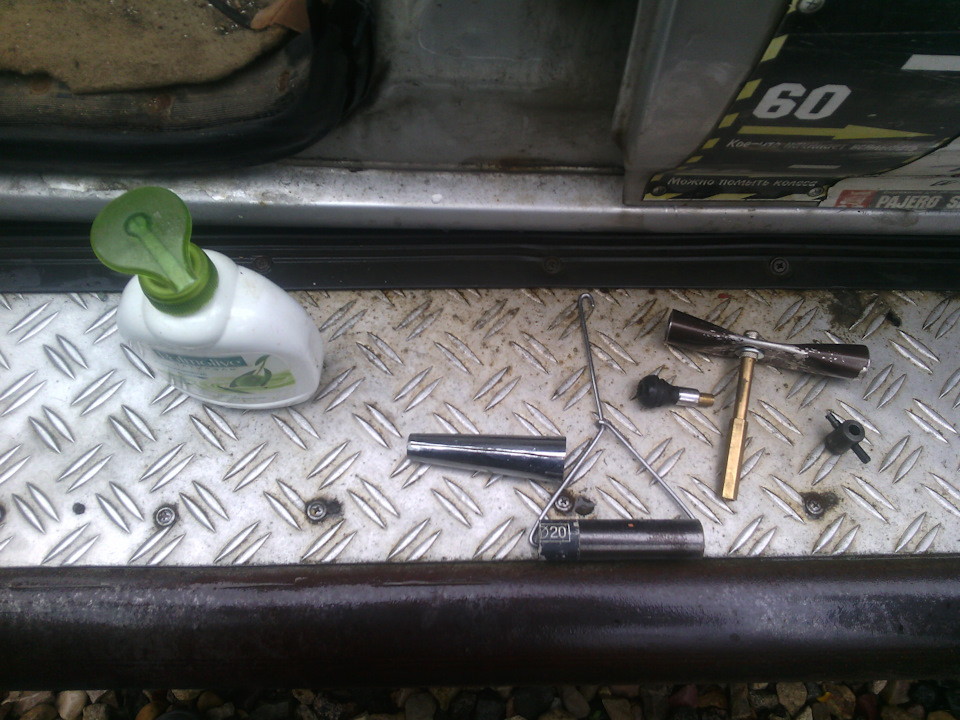 Конус для “утрамбовывания” сделан из трубки, крючок для вытаскивания старого “соска”и, вместо вентильной отвертки, у меня был использован удлинитель вентиля для спаренныхгрузовых колес (он у меня уже был в наличии).Еще нужно мыло и кувалдочка (на фото ее нет).Средний молоток не подходит — массы не хватает продавить — резина пружинит.