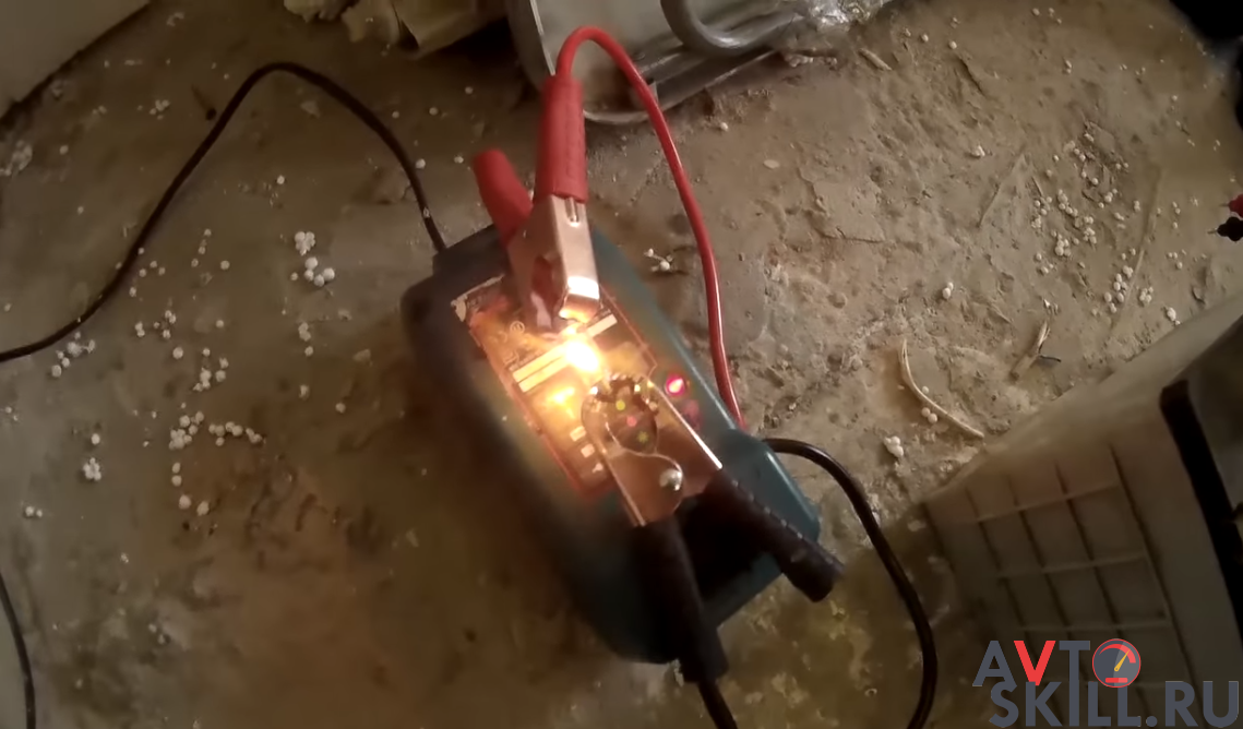 Тогда подключают зарядку от ноутбука и отключают защитную систему. Для этого к плюсу и минусу АКБ подсоединяют провода. Затем проводки соединяют с зарядкой, также соблюдая полярность. Чтобы не создавать перегрузку, подключают лампочку от фары. Она возьмет на себя часть энергии от блока питания.
