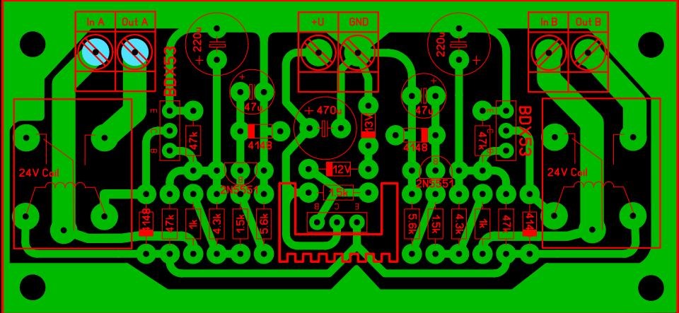 VT1…VT3, VT6, VT7 – Транзистор BC546B (ТО-92) – 5 шт.,VT4, VT5 – Транзистор BC556B – 2 шт.,VT8 – Транзистор КТ972А – 1 шт.,VD1 — Стабилитрон КС212Ж (BZX55C12, 12V/0,5W, корпус DO-35) – 1 шт.,VD2 — Диод 1N4004 – 1 шт.,K1, К2 — Реле электромеханическое (1C, 12VDC, 30mA, 400R) BS-115C-12A-12VDC – 2 шт.,R1 — Рез.-0,25-220 кОм (красный, красный, желтый, золотистый) – 1 шт.,R2 — Рез.-0,25-1 м (коричневый, черный, зеленый, золотистый) – 1 шт.,R3, R4 — Рез.-0,25-11 кОм (коричневый, коричневый, оранжевый, золотистый) – 2 шт.,R5 — Рез.-0,25-10 Ом (коричневый, черный, черный, золотистый) – 1 шт.,R6 — Рез.-0,25-2,2 кОм (красный, красный, красный, золотистый) – 1 шт.,R7 – Перемычка,R8…R11 — Рез.-0,25-22 кОм (красный, красный, оранжевый, золотистый) – 4 шт.,R12, R13 — Рез.-1-22 кОм (красный, красный, оранжевый, золотистый) – 2 шт.,C1, C2 — Конд.47/25V 0511 +105 °С – 2 шт.,C3 – C6 — Конд.47/50V 1021 NPL (47/25V 1012 NPL) – 4 шт.,Клеммник 2к шаг 5мм на плату TB-01A – 5 шт.