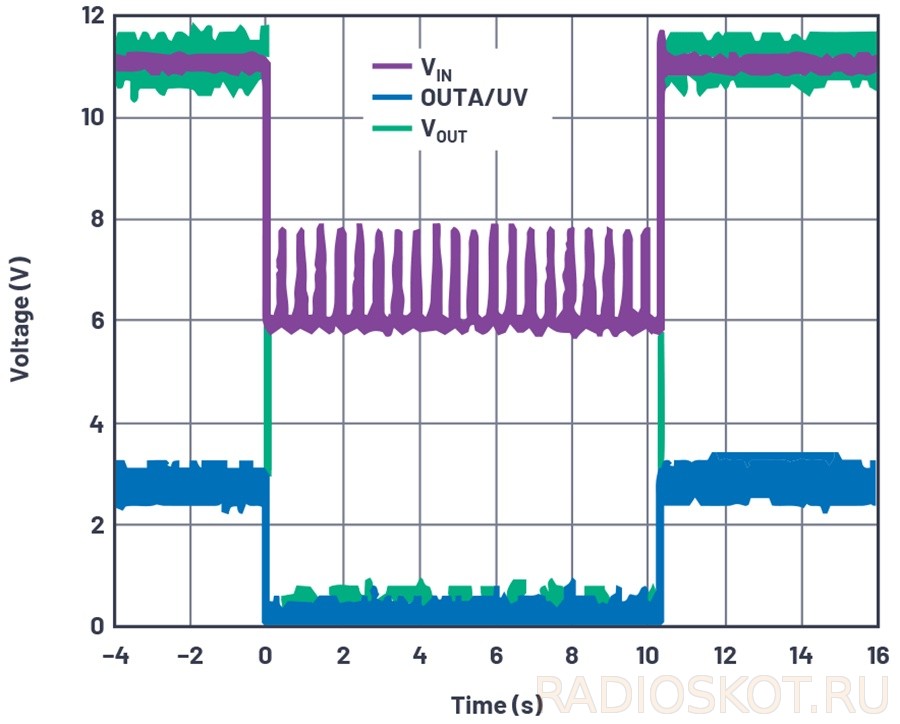 Во время запуска шина 12 В понижается до напряжения 6 В. Порог контроля падения напряжения (7 В) превышается, и OUTA немедленно отключает вывод UV LTC4368-2. LTC4368-2 в ответ подтягивает вывод GATE к низкому уровню, что вызывает отключение переключающего элемента и падение напряжения VOUT до 0 В. Гистерезис 3 В, запрограммированный резистивным делителем мониторинга напряжения, позволяет LTC2966 игнорировать пульсации на шине при включении стартера. В результате переключающий элемент остается выключенным до конца цикла запуска. Когда цикл запуска завершен, напряжение батареи восстанавливается до номинального значения превышающего пороговое значение 10 В. Вывод OUTA подтягивает вывод UV LTC4368-2 к питанию, и переключающий элемент снова подключается.