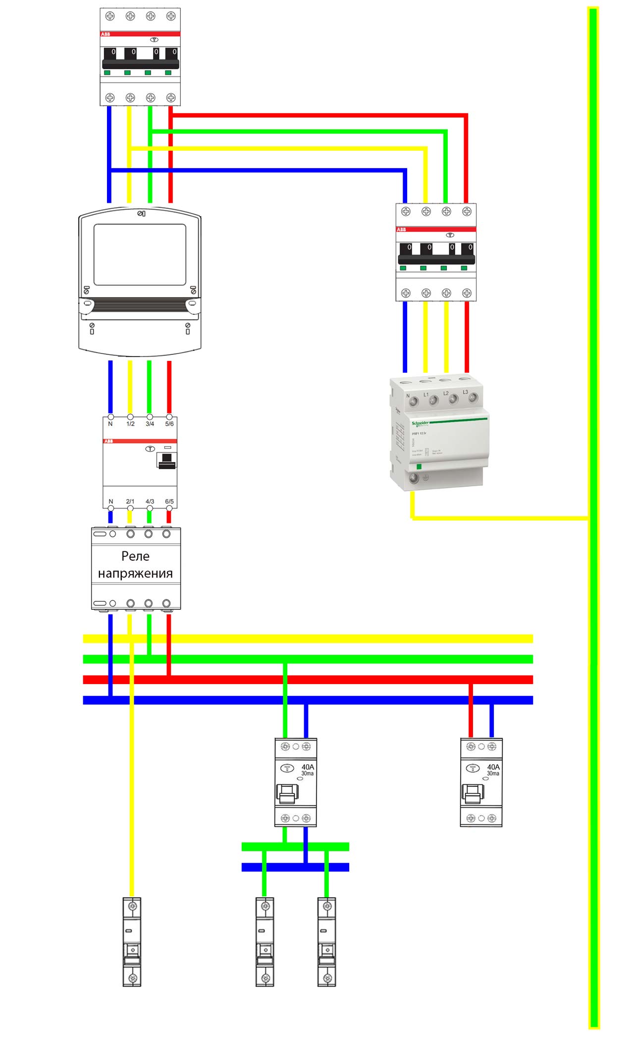 Схема подключения реле напряжения на каждой фазе в сети 380В