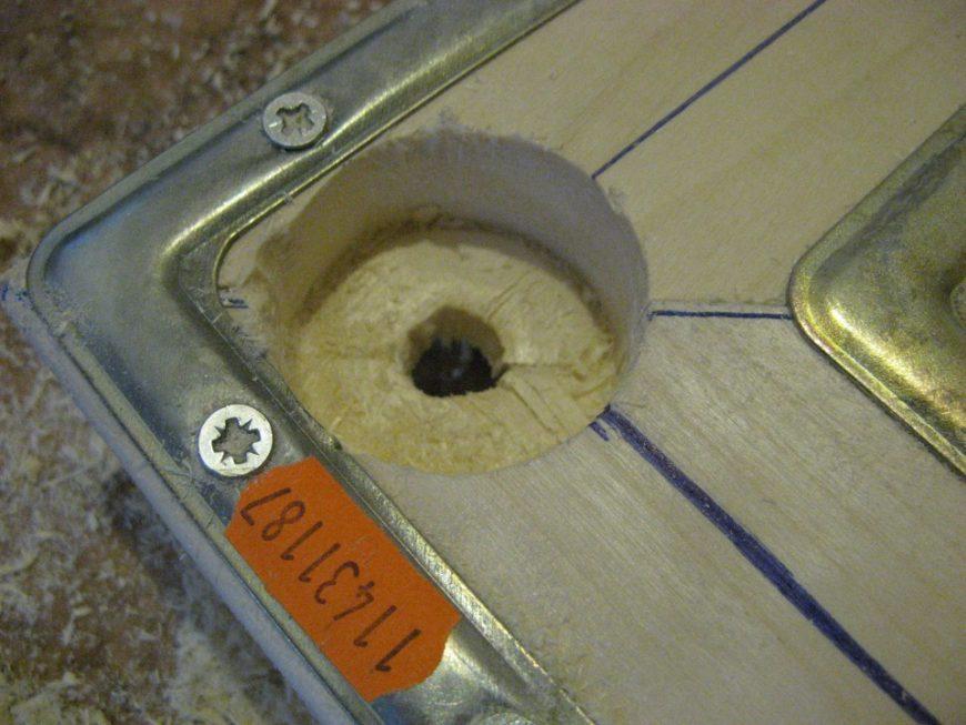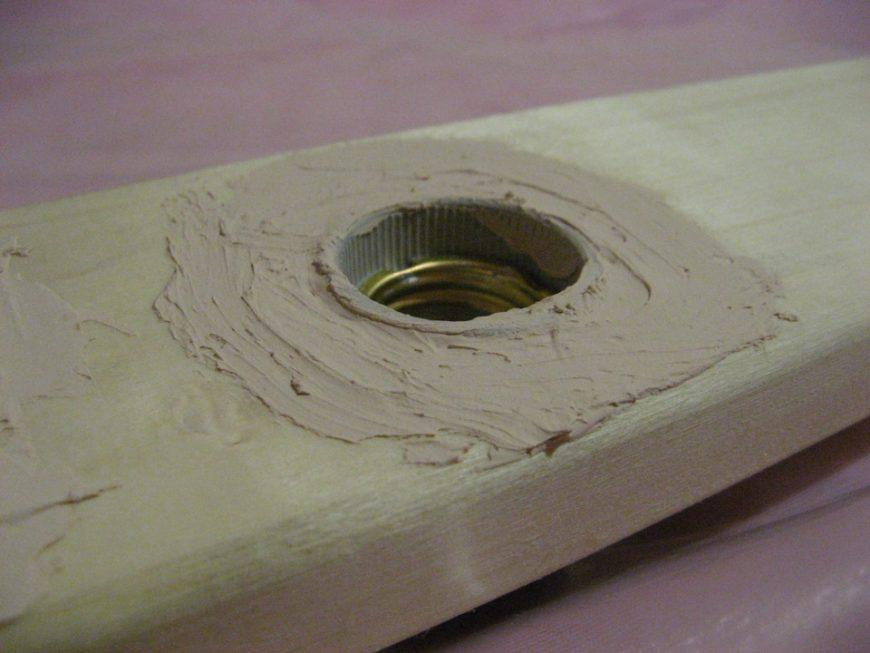 Чтобы работа наша не выглядела топорной, и всё смотрелось, словно изготовлено на заводе, нужно очень тщательно сделать все замеры, пометить места, куда будут ставиться патроны для ламп. Между ними должно быть равное расстояние. И уж только потом можно будет дрелью заготовить эти отверстия.