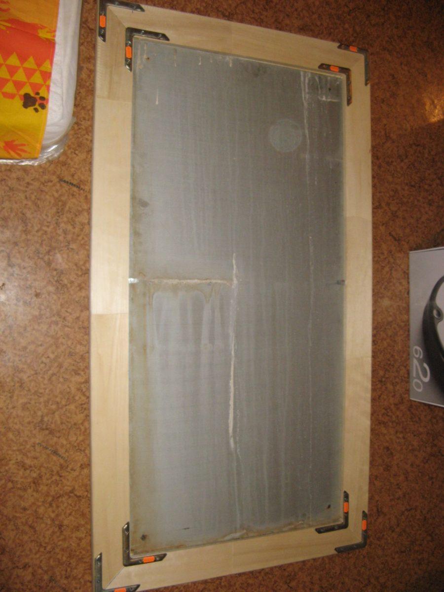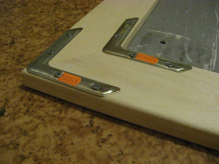 - По величине зеркального стекла из доски или фанеры собирают раму, на которую будут устанавливаться все детали. Торцевые части рамы запиливаются под углом 45 градусов и соединяются друг с другом при помощи металлических уголков, клея и саморезов. Если саморезы длиннее по сравнению с толщиной фанеры, то выдающиеся с другой стороны части следует спилить при помощи болгарки или иного аналогичного инструмента, имеющегося под рукой. В итоге зеркало должно свободно проходить в эту рамку, а по краям должно хватать пространства для последующей установки лампочек.
