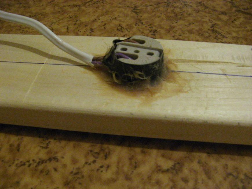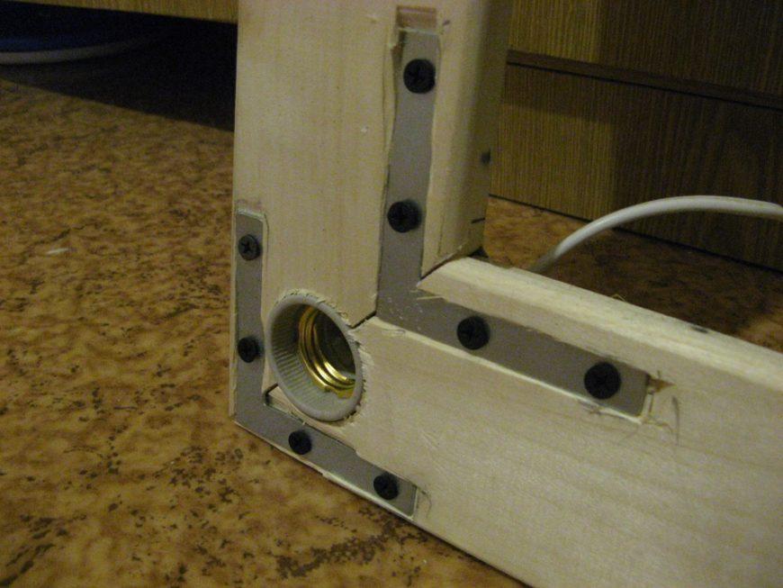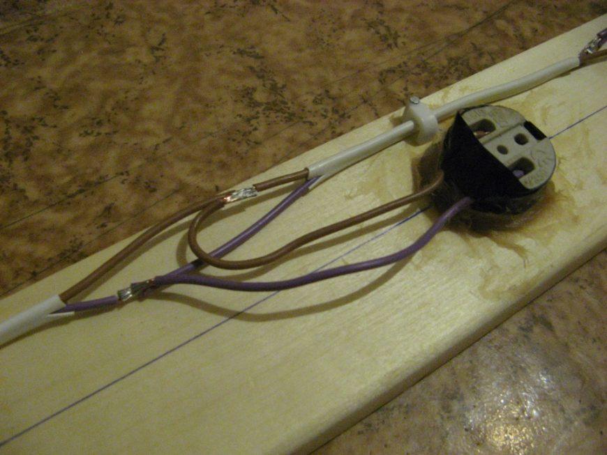 Всё это нужно, чтобы подсчитать мощность и правильно спроектировать электрическую проводку и выключатель. Подводим оголённые концы проводов к патрону и фиксируем. После этого патроны фиксируем в раме.