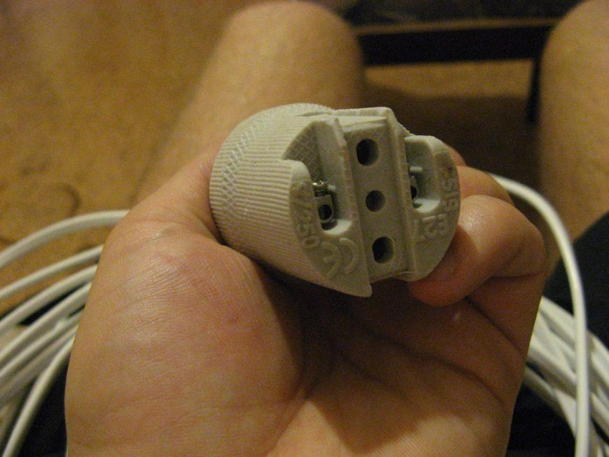 На данном этапе необходимо заняться установкой патронов. Цоколи для патронов могут быть Е27 или Е14 — тут уж как кому больше нравится. Это довольно ответственный этап и нужно тщательно продумать, какого типа лампа будут лучше выглядеть и сколько штук их понадобится.