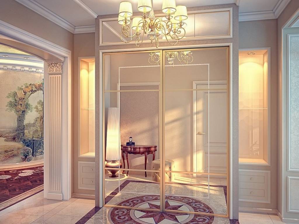 - в коридоре на противоположной от входа стене. Также оптимальным решением будет выбор шкафа с дверями, имеющими зеркальную поверхность. Зеркало в коридоре лучше повесить сбоку от входной двери