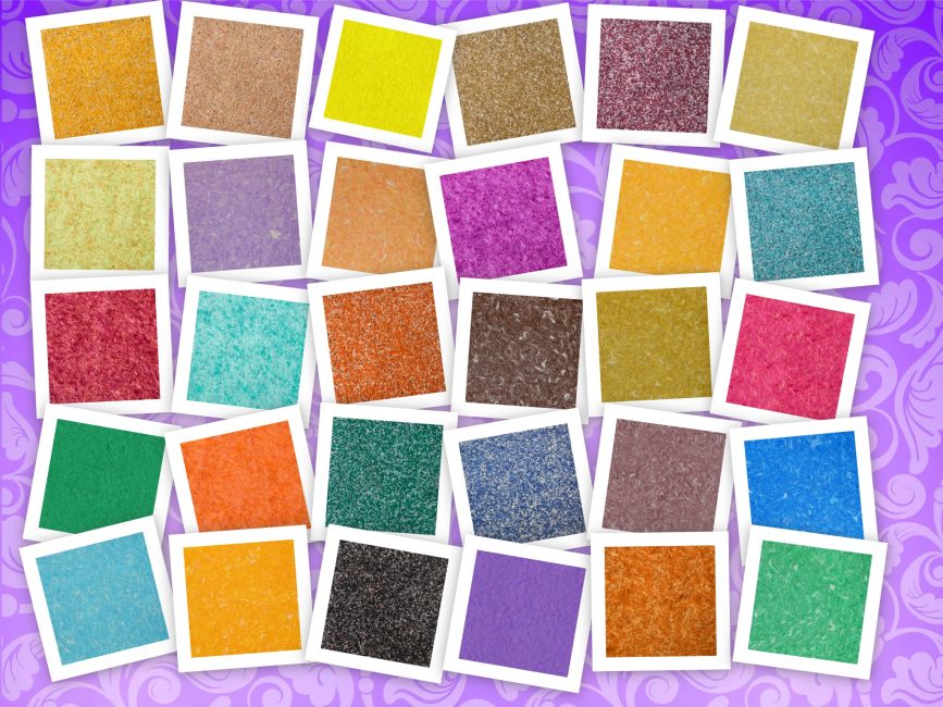 - Не просто широкий – широчайший ассортимент цветов. Более того, путем смешивания есть возможность поиграть оттенками и полутонами или в процессе нанесения сотворить уникальный рисунок из жидких обоев с добавлением золотых или серебряных нитей, переливающейся стружки, вывести на стене необычные фигуры и линии.