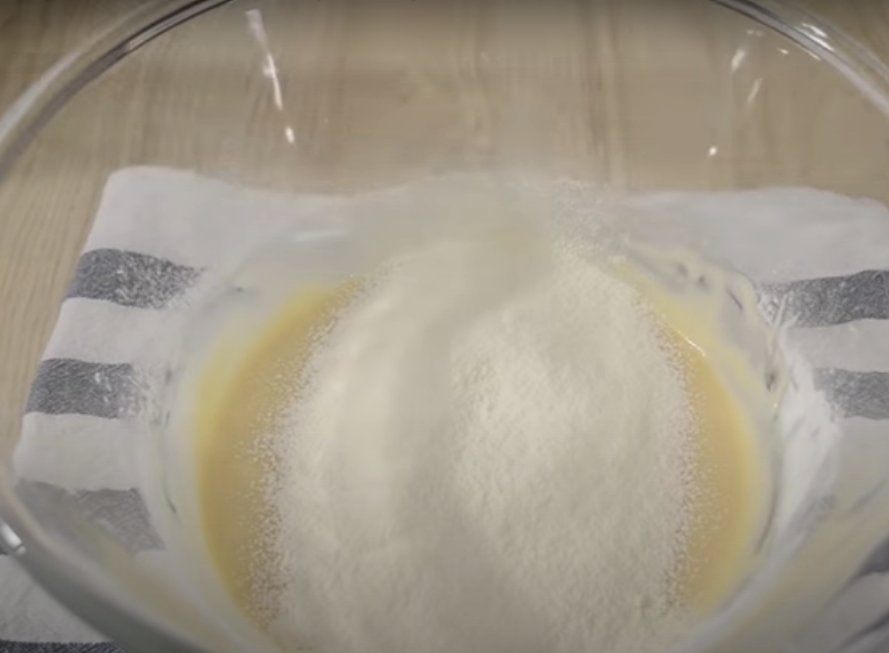 - Отдельную емкость наполните просеянной мукой. Добавьте питьевую воду и хорошо перемешайте до растворения комков. Добавьте щепотку соды и лимонной кислоты. Снова перемешайте.