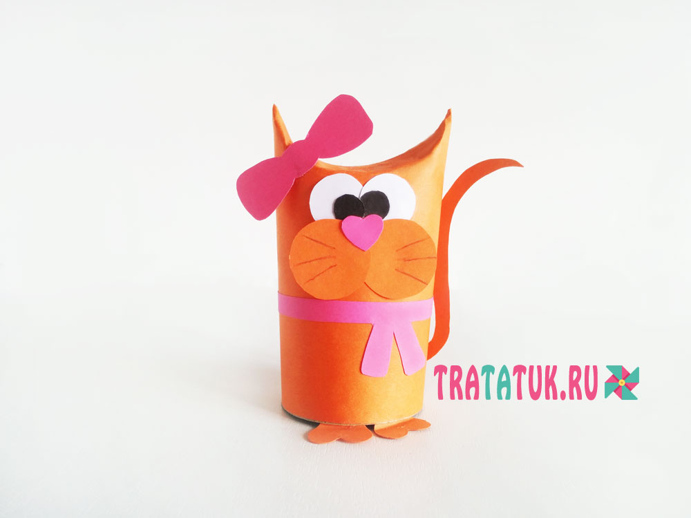 Из втулки, бумажного рулончика можно сделать вот такую замечательную, кокетливую модницу – кошечку. Сам процесс предельно простой, вариаций для творчества – множество.