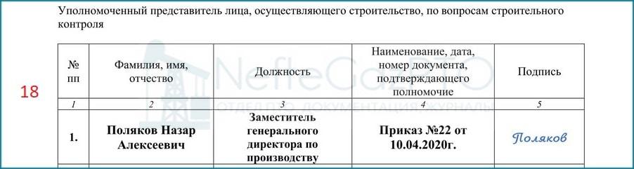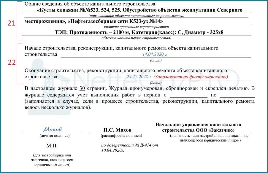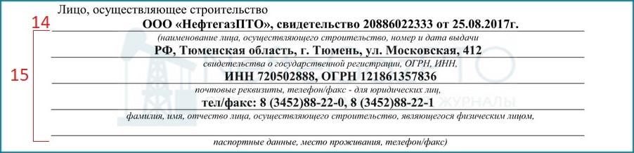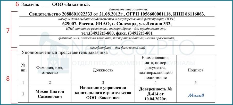 - название фирмы-заказчика и ФИО ее делегированного лица (вносятся данные о датах начала и завершения работ (по графику или контракту и фактические);