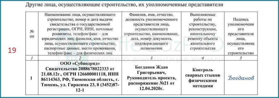 - личные данные о руководителе строительной компании, выступающей в роли подрядчика;