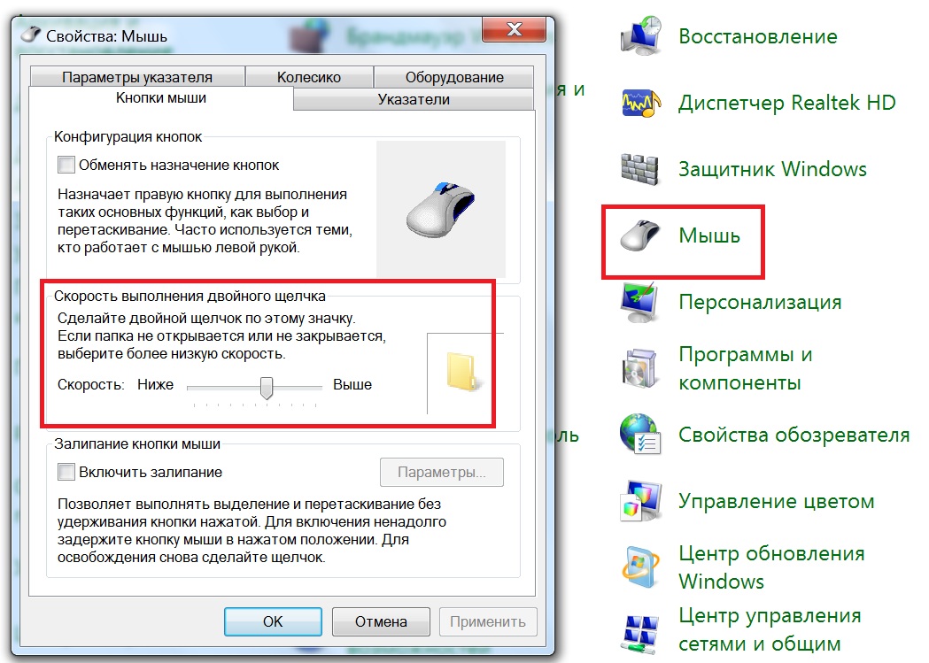 В первой же вкладке «Кнопки мыши» вас интересует ползунок «Скорость выполнения двойного щелчка». Установите ее на несколько пунктов выше, а затем примените изменения.